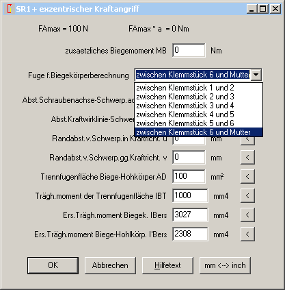 Bislang musste die berechnete Trennfuge zwischen 2 Klemmstücken gewählt werden, bei 2 Klemmstücken wurde die Auswahlbox gar nicht angezeigt. Jetzt kann man auch die Klemmfläche zwischen letztem Klemmstück und Muttergewinde wählen, und die Auswahl wird immer angezeigt.