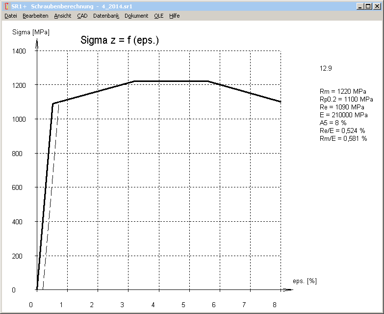 In der mat_bolt Datenbank wurde die Bruchdehnung ergänzt, und zusammen mit E-Modul, Zugfestigkeit und Streckgrenze bzw. Rp0.2-Grenze ein Spannungs-Dehnungs-Diagramm für den Schraubenwerkstoff konstruiert.