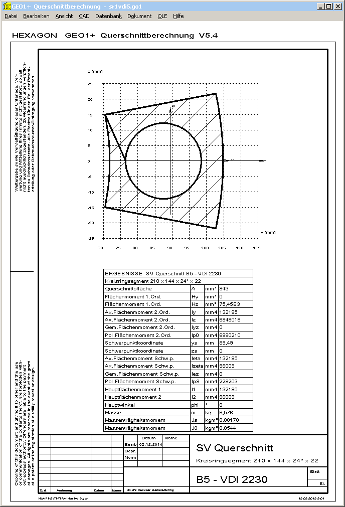 Die Koordinaten der Trennfläche wurden angegeben mit ri=72mm, re=105mm, alpha = 24°, rS=87,5mm und dh=22mm. GEO1+ berechnet ys=89,49 mm. Dann ist ssym = ys – rS = 89,49-87,5 = +1,99 mm, u = ys – ri = 89,49 mm und v= re - ys = 15,51mm.