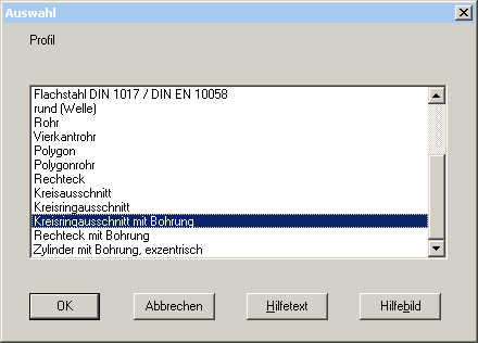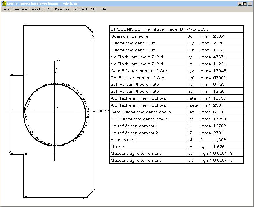 Die GEO1-Software leistet bei der Berechnung der Trennfläche und Biegekörper bei exzentrischen Schraubenverbindungen gute Dienste. Allerdings war die Eingabe der Koordinaten etwas umständlich, deshalb kann man jetzt Kreissegment, Kreisringsegment und Kreisringsegment mit Bohrung einfacher eingeben mittels Außendurchmesser, Innendurchmesser, Segmentwinkel, Bohrungsdurchmesser und Lochkreisdurchmesser. Außerdem Rechteck mit Bohrung und Kreis mit exzentrischer Bohrung für Trennfugen von prismatischen und zylindrischen Schraubenverbindungen. Die Profilauswahl gibt es nur in TR1 und in der Plus-Version GEO1+; in GEO1 muß man die einzelnen Koordinaten der Kontur eingeben. Künftig gibt es nur noch GEO1+. Die einfache Version GEO1 ohne Profildatenbanken gibt es ab sofort nur noch als Update.