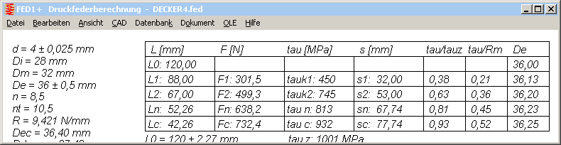 Die Tabelle mit Kräften und Federlängen wurde um den Außendurchmesser unter Last ergänzt. Da die Formel in der EN 13906 nur die Vergrößerung bei Blocklänge berechnet, musste die Formel neu hergeleitet werden: