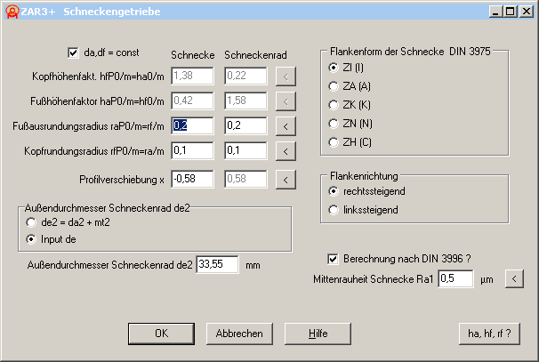 Wenn "da,df = const" gesetzt ist, kann man jetzt nur noch den Profilverschiebungsfaktor x1 der Schnecke eingeben, um die Kopf- und Fußhöhenfaktoren zu berechnen. Die Profilverschiebung x2 muß –x1 sein, daß Kopf- und Fußkreisdurchmesser gleich bleiben.
