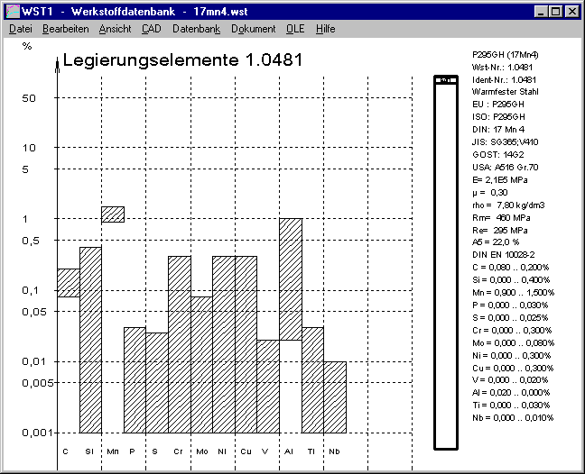 In einem neuen Diagramm werden min- und max- Werte der Legierungselemente als Balkengrafik angezeigt. Der Maßstab für die Legierungsanteile in Prozent ist logarithmisch, so daß auch kleine Zahlenwerte erkennbar sind.