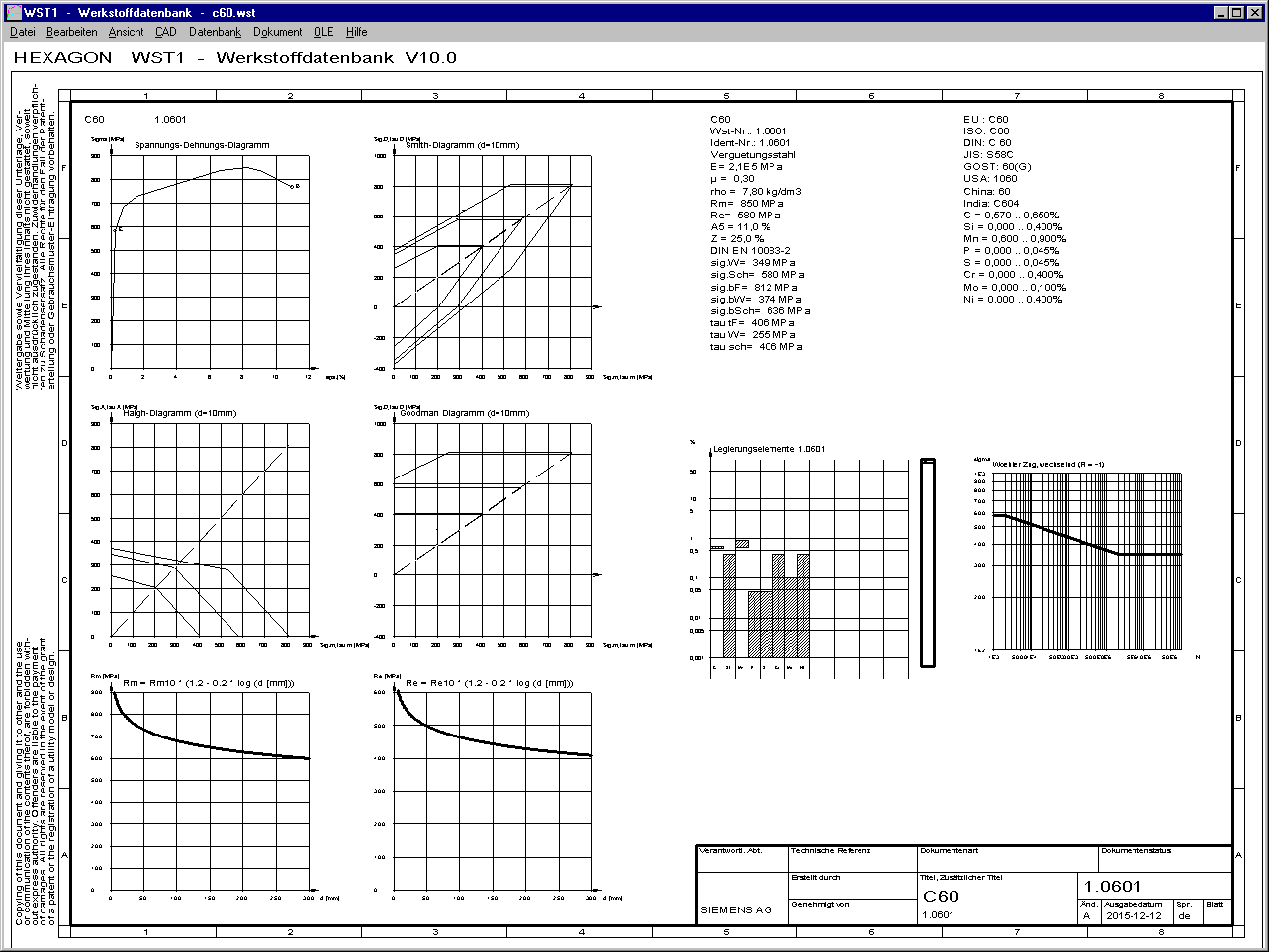 In der Quick4-Ansicht werden die Werkstoffdaten mit den wichtigsten Diagrammen im DIN A3 Zeichnungsrahmen nach ISO 7200 oder DIN 6771 auf einer Bildschirmseite angezeigt.