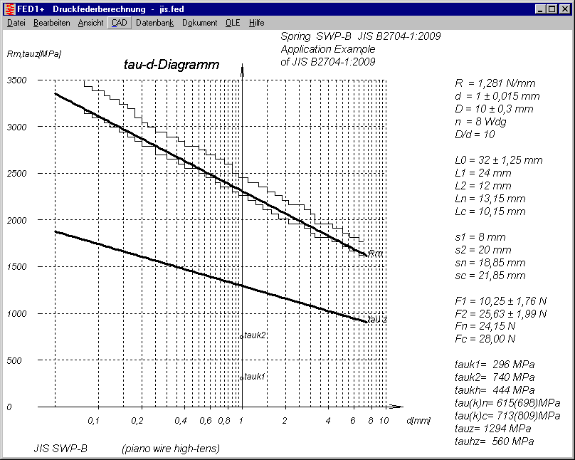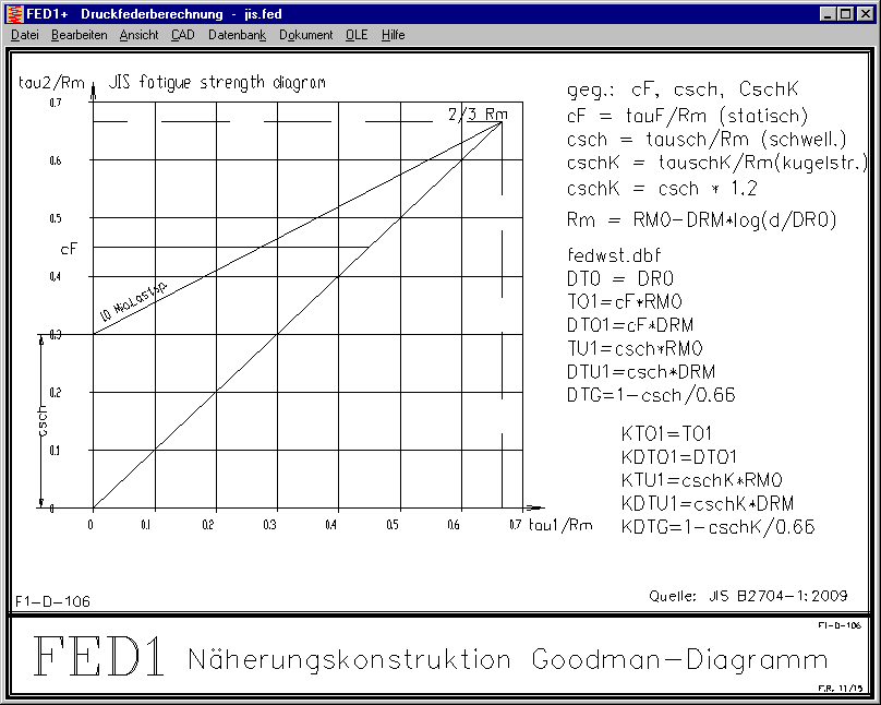 Mit der zulässigen Hubspannung bei schwellender Last (tau1=0) aus dem Goodman-Diagramm wird das JIS-Dauerfestigkeitsdiagramm konstruiert. Somit gibt es bei den Federprogrammen jetzt 5 verschiedene Dauerfestigkeitsschaubilder zur Auswahl: Goodman, Haigh-Goodman, Smith, SN (Wöhler) und JIS.