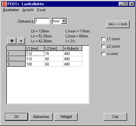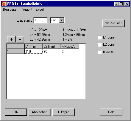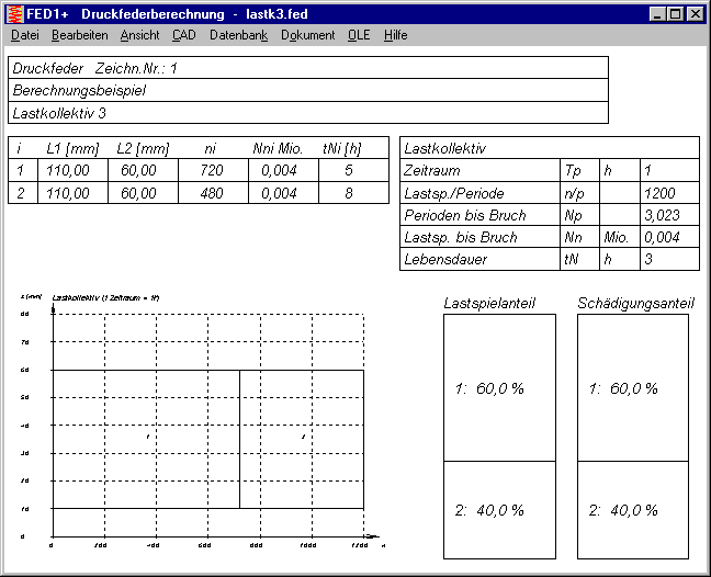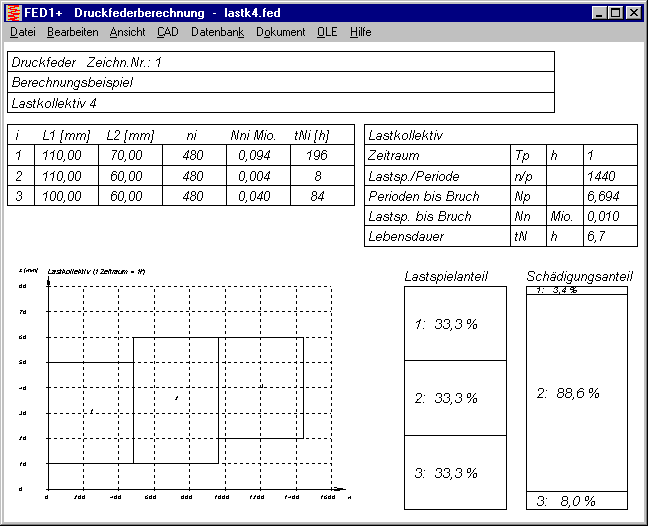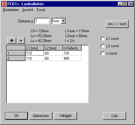 In der klassischen Betriebsfestigkeitsberechnung wird das Lastkollektiv über die Spannungsamplituden und Summenhäufigkeit der Lastspiele über die gesamte Lebensdauer definiert. Für die Federberechnung ist das unpraktisch, Amplitude wäre die halbe Hubspannung bei veränderlicher Mittelspannung. Auch die Zeitskala über 10 Millionen Lastspiele ist unpraktisch. Deshalb wird ein Beobachtungszeitraum definiert, in dem die Lastspiele gezählt und Federlängen gemessen werden. Die Bezeichnung und Eingabe des Beobachtungszeitraum in Sekunden war etwas unglücklich, deshalb wurde hier nachgebessert. "Periodendauer" wurde umbenannt in "Zeitraum", weil damit nicht die Periode einer Schwingung, sondern der Zeitraum gemeint ist, auf den sich die eingegebenen Lastspiele beziehen. In der englischen Version bleibt "period", das englische Wort für Zeitraum. Und der Beobachtungszeitraum muß jetzt nicht mehr in Sekunden eingegeben werden, sondern kann auf Minuten, Stunden, Tage oder Jahre umgeschaltet werden. Nachfolgend 4 Berechnungsbeispiele mit einfachen Lastkollektiven: