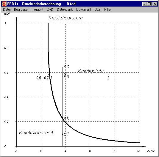 Falls Knickung bei Federweg s2 auftritt, werden im Knickdiagramm Punkte für die Lagerungsbeiwerte nue=0.5, 0.707, 1 und 2 (*L0/D) eingezeichnet. Dadurch kann man erkennen, ob und wie die Lagerung verändert werden kann, daß die Feder nicht mehr knickt.