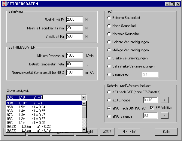 Bei der Wälzlagerberechnung wurde für den Lebensdauerbeiwert a1 die Erlebenswahrscheinlichkeit 99.2%, 99.4%, 99.6%, 99.8%, 99.9%, 99.92%, 99.94% und 99.95% aufgenommen. "Erlebenswahrscheinlichkeit" heißt jetzt "Zuverlässigkeit", und auch die a1-Werte von 90% bis 99% wurden leicht modifiziert.