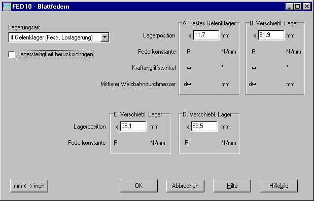 Das Eingabefenster für die Lagerung sieht jetzt gleich aus wie im Wellenberechnungsprogramm WL1+. Das erleichtert die Eingabe von mehreren Auflagerpositionen und Auflagersteifigkeiten, wenn auch bei Blattfeder und Träger eine feste Einspannung bei x=0 überwiegen dürfte.