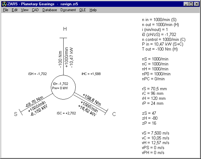 Rotational speed and power at sun shaft (S), carrier (C) and hollow wheel (H) have been added to Wolf diagrams, and also planet gear transmission ratio i0 (zH/zS) and pitch power Pw.