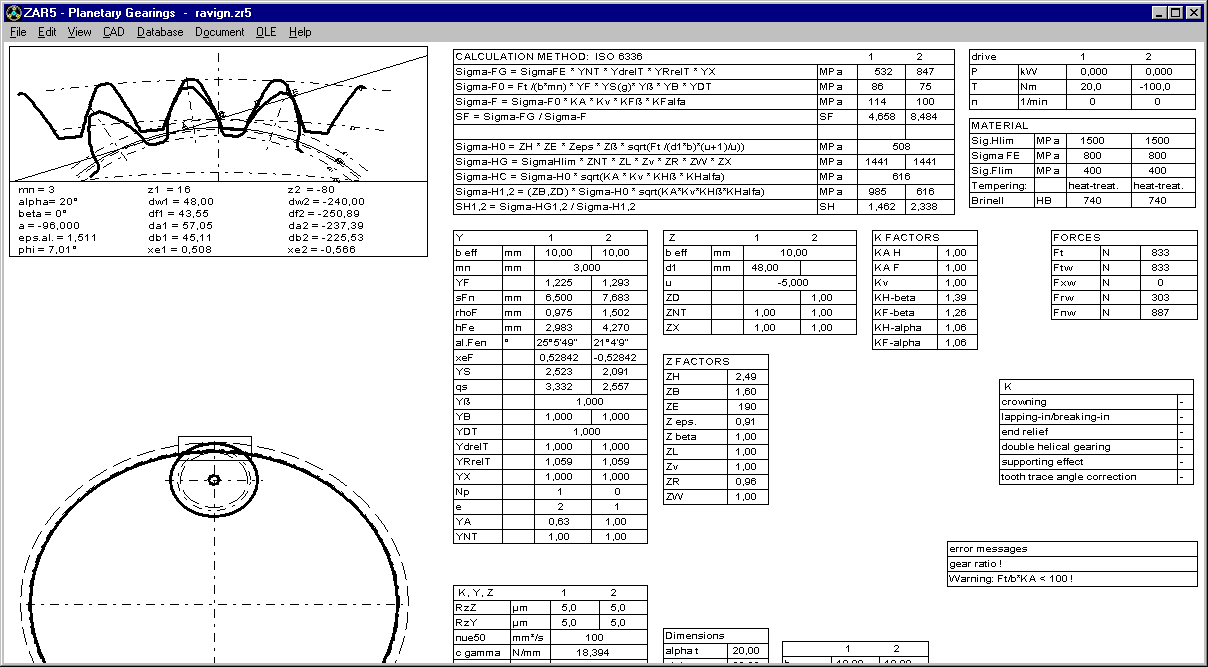 ZAR5: Screen graphic of gear pairs dimensions and strength calculation