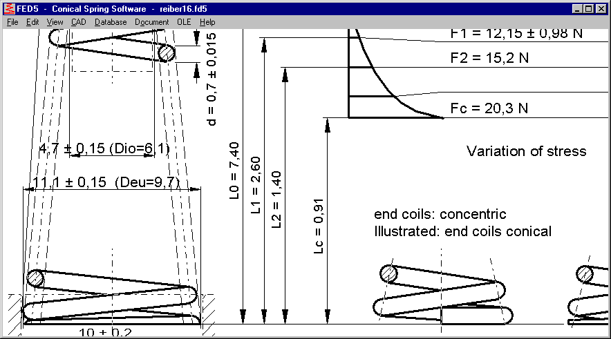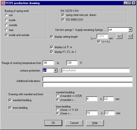 If concentric end coils defined, FED5 production drawing includes dimensions of minimum inside diameter and maximum outside diameter of the end coils instead of coil diameters (coil diameters Dio and Deu in brackets). Production drawing always illustrates conical end coils.