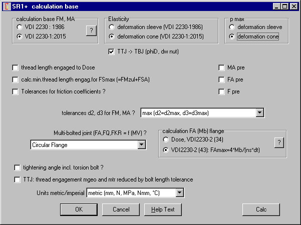 In earlier versions of SR1, pressure F/A between clamping plates was calculated with virtual external diameters according to VDI 2230:1986. At "pmax" you now can calculate pressure from section area of the deformation cones. If TTJ, better set "TTJ -> TBJ (phiD, dwnut)", else you may get too large cross-section area resulting in too low pressure. In most cases, flank pressure safety margin remains the same, because maximum value applies between bolt head or washer and first clamping plate, or between nut and last clamping plate.