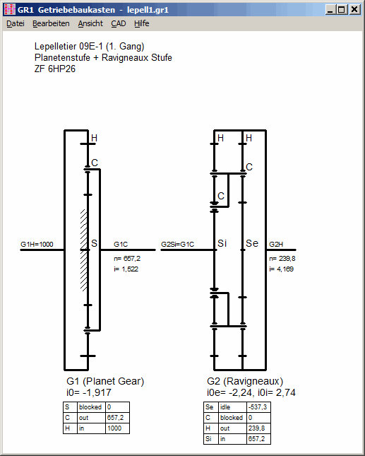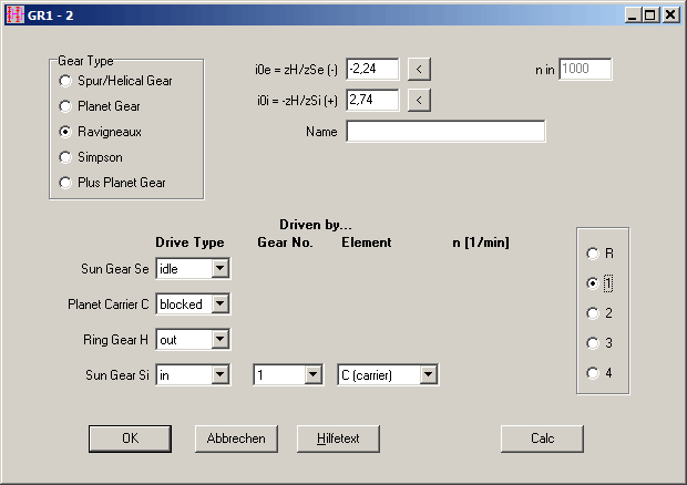 GR1 calculates speed and transmission ratio of multistage gears composed of gear pairs, planetary gear sets, plus planetary gear sets, Ravigneaux planetary gear sets or Simpson planetary gear sets.