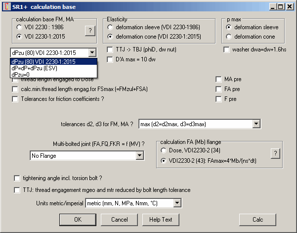 Use default method 1 if you think that calculation according to VDI2230-1:2015 is correct. Configure method 2 if elasticity of nut thread should be considered in δP. Configure method 3 if elasticity of nut thread should not be considered in δP.