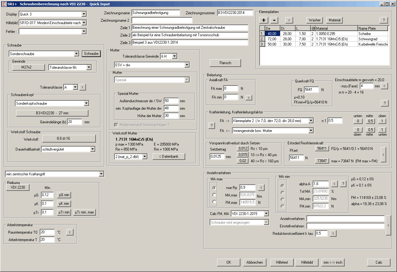 Das neue Quick-Eingabefenster in SR1+ ist wegen der Vielzahl von Eingaben (Schraube, Mutter, Klemmplatten, Reibung, Last, Anziehverfahren, exzentrisch) ziemlich groß geraten, 1280x900 Pixel. Wenn man daneben noch das Hauptfenster mit der Ergebnisgrafik unverdeckt darstellen will, ist eine Bildschirmauflösung von 2560x1080 oder größer vorteilhaft. Mindestauflösung ist 1280x1024, aber dann wird die Ergebnisgrafik vom Eingabefenster komplett verdeckt.