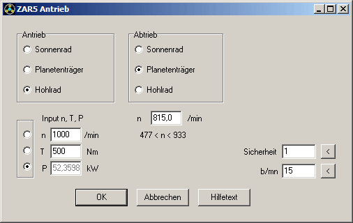 In der Vorauslegung von ZAR5 kann man jetzt (gleich wie in ZAR1+) zwei der Eingangsgrößen Drehzahl, Drehmoment, Leistung eingeben, die fehlende wird berechnet. Für die Eingabe der Abtriebsdrehzahl wurden die Grenzdrehzahlen präziser berechnet (unterhalb Eingabefeld n). Außerdem kann man Parameter für einen Sicherheitsfaktor und Zahnbreite/Normalmodul vorgeben. Sicherheit kleiner 1 berechnet kleinere Abmessungen, Sicherheit größer 1 berechnet größere Abmessungen.