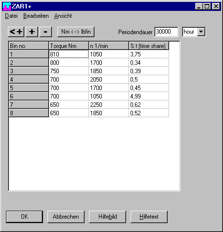 ZAR1+,ZAR2,ZAR5,ZAR6,ZAR7,ZAR8: Eingabe Lastkollektiv mit Drehzahlen