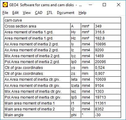 For cams and noncircular gears, a table with area, area moments of inertia and coordinates of gravitation center has been added. Calculation and table are same as in GEO1.