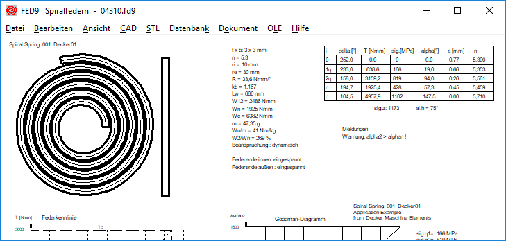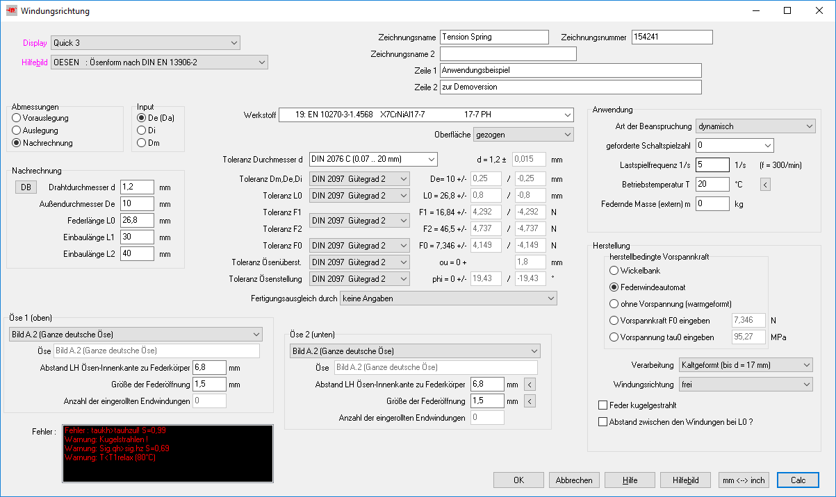 Werden die Ösen gegeneinander verdreht, so wird die Zugfeder wie eine Drehfeder beansprucht. Für diesen Fall wird jetzt die Drehfederkonstante cM in Nmm/° berechnet und mit ausgedruckt.