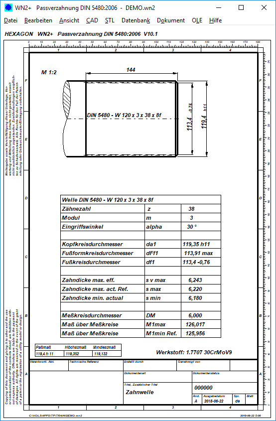 Bisher wurde das berechnete Maschinenelement so in ein A4-Blatt eingepasst, daß die Zeichenfläche ausgefüllt war. Jetzt wird das Teil im nächstkleineren Norm-Maßstab 1:1, 1:2, 1:5, 2:1, 5:1 usw. eingefügt.