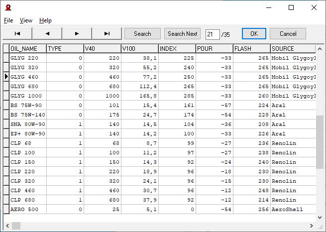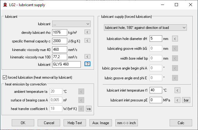 Until now, the lubricant had to be selected between ISO VG2 and ISO VG 1500. Now you can also select a lubricant from the lubri.dbf database, or enter another lubricant by specifying the kinematic viscosity at 40 ° C and at 100 ° C.