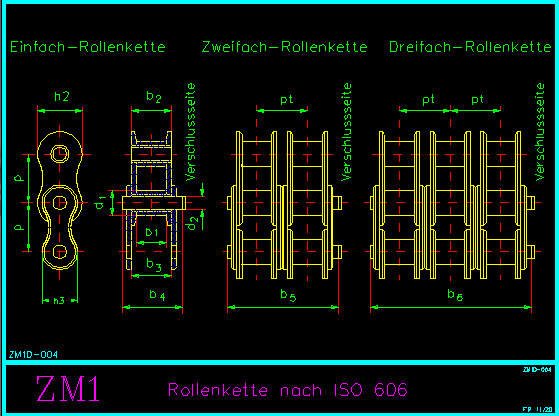 Die Kurzbezeichnungen im ZM1 Ausdruck und Quick-Ansicht wurde nicht generell auf die ISO-Bezeichnungen umgestellt: Je nachdem ob man eine Kette aus der DIN-Datenbank oder der ISO-Datenbank gewählt hat, sind die ausgedruckten Kurzzeichen nach DIN oder nach ISO. So kann man sich an die neuen Bezeichnungen gewöhnen, oder die alten beibehalten. Beispiel: Der Rollendurchmesser ist jetzt "d1" statt "dR". Verwirrend: der Teilkreisdurchmesser von Rad 1 ist ebenfalls "d1". Und "dR" ist jetzt der Prüfstiftdurchmesser für Messung des Fußkreisdurchmessers mit Prüfmaß dM. Und "Fu" ist nicht die Umfangskraft, sondern die Mindestbruchkraft der Kette.