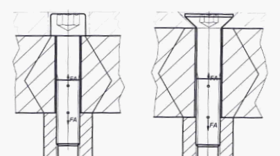 Ähnlich ist des bei Senkschrauben. Hier wird die Klemmplatte aber im Bereich der Senkung zumindest teilweise geklemmt, man kann deshalb die Höhe der Klemmplatte auch nur um einen Teil der Kopfhöhe kürzen. In der VDI 2230 gibt es keine Senkschrauben, in SR1 werden Senkschrauben deshalb wie Zylinderschrauben berechnet. Entsprechend ist auch die zeichnerische Darstellung mit dem Senkkopf auf der Klemmplatte.