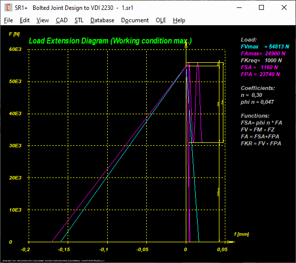 FSA and FPA are now drawn in the load-extension diagram in operating state (min / max / req). This is the distribution of the external force FA (FAo) on the bolt (S) and the plates (P).