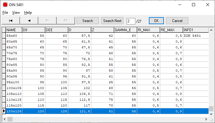DIN 5481 for serrations covers the sizes 7x8 to 55x60. There are also 60x65 to 120x125 in the WN8 database. For these non-standardized sizes, fillet radii have been added in the database (RI_MAX and RE_MAX).