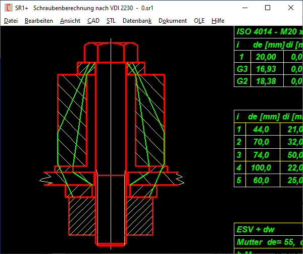 Unter "Berechnungsmethode" kann man jetzt mit "di Verformungskegel" die Bohrung in Klemmplatten als Verformungskegel statt als Zylinder bei der elastischen Nachgiebigkeit berechnen. Wenn man Klemmplatten mit normgerechten Bohrungen verwendet ist das uninteressant, das Ergebnis bleibt immer dasselbe. Nur wenn man mehrere Klemmplatten mit wechselndem Innendurchmesser oder Langloch verwendet, ändert sich die elastische Nachgiebigkeit deltaP. Statt dem Innendurchmesser der Klemmplatte wird dann ein Kegel aus den inneren Anlagedurchmessern der benachbarten Klemmplatten verwendet.