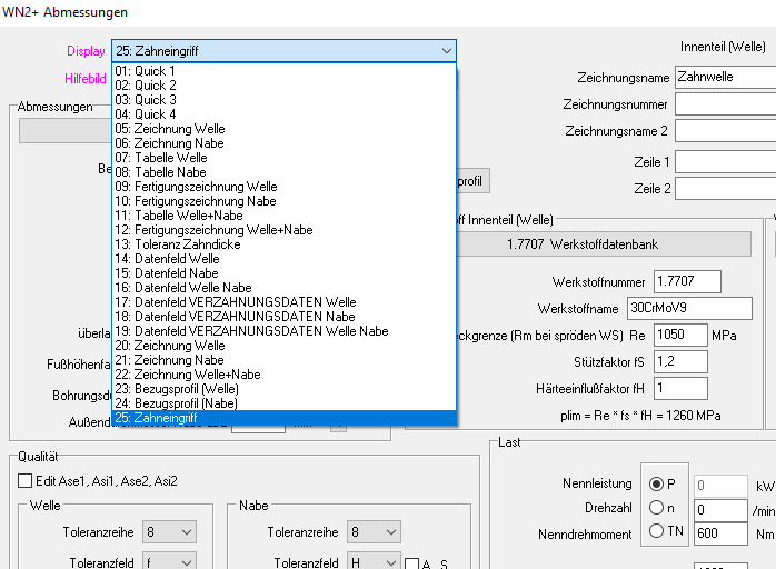 In der Quick-Eingabe sind 5 zusätzliche Ergebnisgrafiken wählbar unter Display: Zeichnung Welle, Zeichnung Nabe, Bezugsprofil Welle, Bezugsprofil Nabe, Zahneingriff (die im Hintergrundfenster angezeigte Ergebnisgrafik wird mit "Calc" Button aktualisiert).