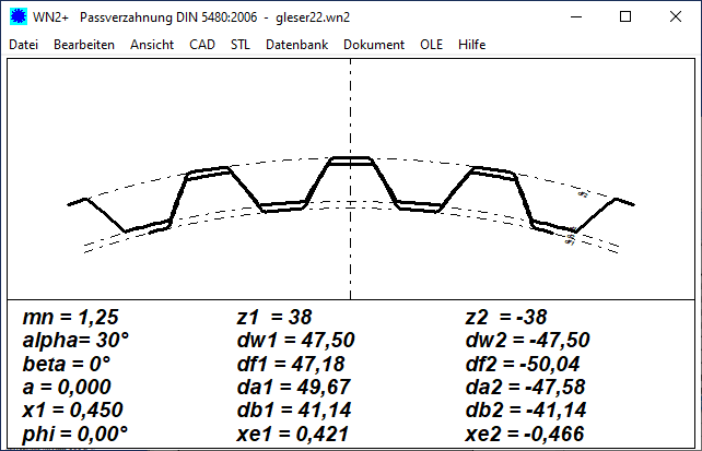 In WN2+ könnte man für eine zeichnerische Darstellung (allerdings ohne Kantenbruch) die Zahnhöhenfaktoren für Außen- und Innendurchmesserzentrierung berechnen und einsetzen.