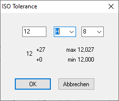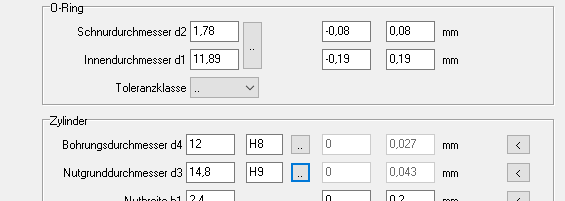 Mit den ".." -Buttons bei der Toleranzeingabe werden ISO-Toleranzfelder zur Auswahl angezeigt. Bei Innendichtung waren Kleinbuchstaben für Wellentoleranzen statt Großbuchstaben für Bohrungstoleranzen angezeigt, das wurde korrigiert. Man kann das ISO-Toleranzfeld auch direkt eingeben, DI1 berechnet dann Höchstmaß und Mindestmaß.
