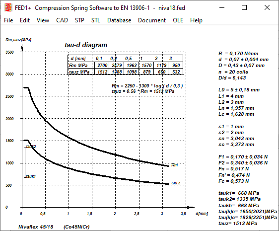Nivaflex 45/18 is a "watchmaker's wire" made of 45% cobalt, 21% nickel, 18% chromium, 5% iron, 4% tungsten, 4% molybdenum and 1% titanium, preferably for micro springs between 0.2 and 0.5 mm in diameter. Fatigue strength values are not available, tensile strength values hardened, 2h 550°C. There was already a similar material in the material database, Nivaflex 45/5, with slightly higher strength and fatigue strength data. The only difference to Nivaflex 45/18 in the chemical composition is that Nivaflex 45/5 in addition to 45% cobalt, 21% nickel, 18% chromium, 5% iron, 4% tungsten, 4% molybdenum and 1% titanium still contains 0.2% beryllium.