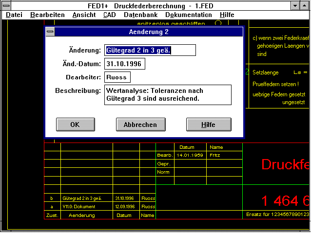 Unter "Dokument->Änderungen" können jetzt bei den Federprogrammen bis zu 8 Änderungen eingetragen werden mit Beschreibung, Datum und Name des Bearbeiters. Bei den Federprogrammen FED1+, FED2+, FED3+,