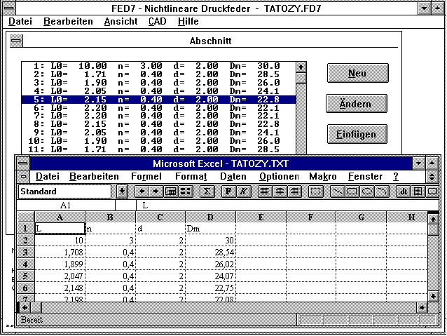 Die Tabelle mit L,n,d,Dm für die Windungsabschnitte können Sie nun auch in Excel, Quattro Pro, StarOffice oder ein anderes Tabellenkalkulationsprogramm übernehmen, verändern, abspeichern, und dann wieder in FED7 übernehmen. Das bietet sich an, wenn Sie ein Federmodell erzeugen wollen, das nicht aus den Formen in FED7 (zylindrisch, konisch, tonnenförmig, tailliert) zusammengesetzt werden kann. So könnten Sie hier z.B. auch eine Verjüngung des Drahtdurchmessers als Formel programmieren, und die Tabelle dann in FED7 übernehmen. Als Format wird das Textformat verwendet mit Trennung der Tabellenwerte durch Tab.
