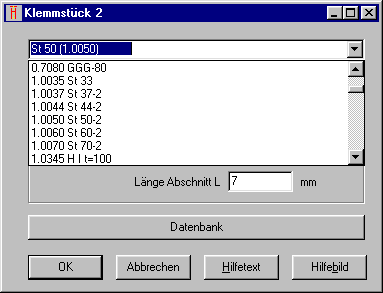 Bei den neuesten 32-bit Versionen gab es bei 2 und mehr Klemmstücken beim Wechsel des Werkstoffs Probleme, wenn die Datei abgespeichert und später geöffnet wurde. Der Fehler wurde behoben, außerdem werden die Werkstoffe in der Liste jetzt mit angezeigt. Für Hinweise und Verbesserungsvorschläge bedanke ich mich bei Herrn Stoll von Siemens Duewag, Krefeld-Uerdingen.