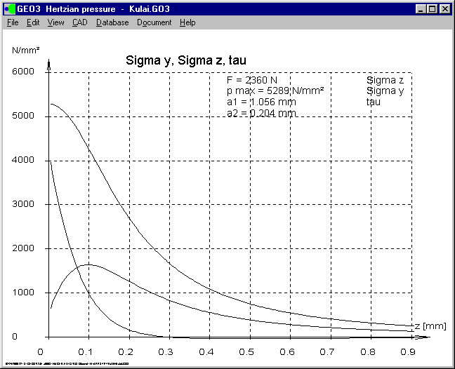 Many extensions have been added to the GEO3 software for calculation of Hertzian pressure. The permissible pressure of the material is considered now with 1.66*Re (yield point), GEO3 generates an an error message. If overridden. The material databse was extended, now all material base data of WST1 are available.
