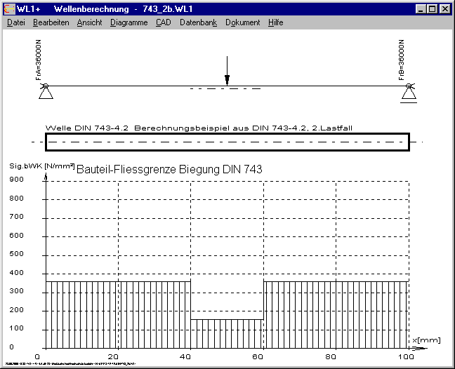 Die Berechnungsbeispiele in DIN 743-4 sind etwas unglücklich gewählt, wahrscheinlich waren hier reine Theoretiker am Werk. So kommt in Beispiel 1 und Beispiel 3 ein Biegemoment mit statischem und wechselndem Anteil zur Anwendung. In der Praxis kommt dieser Fall so gut wie nie vor, für drehende Wellen bewirken alle statischen Querkräfte und Streckenlasten eine dynamische Beanspruchung. Bei sich drehenden Wellen wirkt die Biegespannung immer wechselnd, auch wenn die Querkräfte statisch wirken (Umlaufbiegung). In WL1+ kann man für Drehmomente und Axialkräfte wählen, ob sie statisch, schwellend oder wechselnd wirken. Die Biegespannung wird jedoch immer als wechselnde Last berücksichtigt.