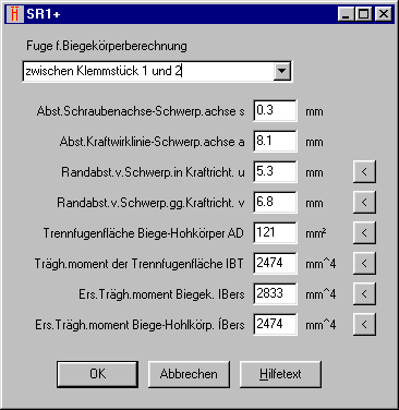 Mit den "<"-Buttons kann man Vorgabewerte berechnen lassen. Die berechneten Flächen und Flächenträgheits-momente beziehen sich jedoch auf die eingegebenen Ersatzdurchmesser der Klemmteile, meist wird man es jedoch mit unsymmetrischen Klemmteilen zu tun haben. Für die Berechnung von Flächen, Schwerpunkt und Flächenträgheitsmoment ist die GEO1-Software geeignet.