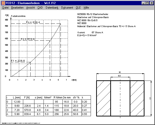 FED12 zeichnet Diagramme von Federkennlinie, Federrate und E-Modul. Für die Übernahme in CAD kann man eine maßstäbliche Zeichnung als DXF oder IGES-Datei generieren. Eine Fertigungszeichnung mit bemaßter Elastomerfeder kann man direkt ausdrucken. In einer Animation lässt sich die Verformung der Elastomerfeder bei Belastung am Bildschirm simulieren.
