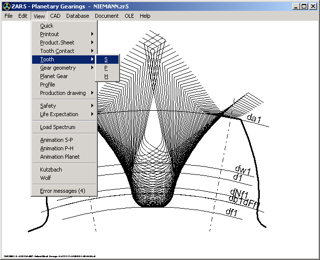 New menu items are "View->Tooth" and "View->Gear Geometry" with drawings of tooth gap and gear wheel for sun, planet and ring gear.