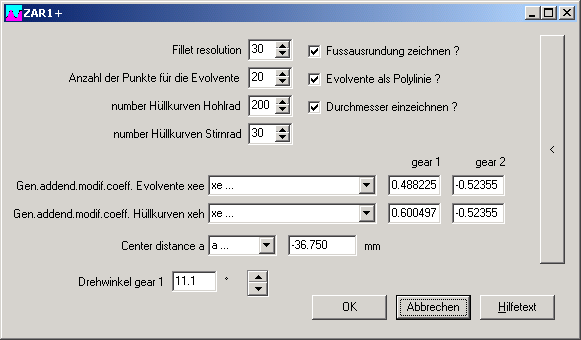 Unter Anzeigen-Zahneingriff gibt es jetzt ein Untermenü für Zahneingriff ohne oder mit Optionsfenster. Neu bei den Einstellmöglichkeiten ist ein Auf/Ab-Knopf zum Verstellen des Drehwinkels. Das Verzahnungsbild wird nach Änderung von Einstellungen sofort im Hintergrund aktualisiert (ohne OK oder Enter).