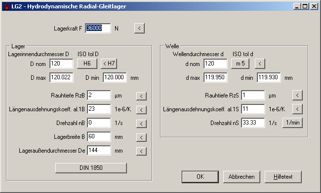 Für die Berechnung der Gleitlagerung sind zunächst Lagerkraft und Abmessungen, Toleranzen, Rauhtiefe von Gleitlager und Welle, Längenausdehnungskoeffizienten einzugeben. Größt- und Kleinstdurchmesser der Lagerbohrung im eingepressten Zustand kann man alternativ durch Eingabe einer ISO-Passung berechnen lassen. Die Abmaße des Wellendurchmessers berechnet LG2 aus dem Richtwert für das empfohlenen Lagerspiel nach DIN 31652.