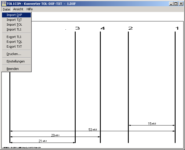 Mit TOL1CON können Sie sich die Erfassung der Maßelemente von der Zeichnung erleichtern. TOL1CON liest die horizontalen und vertikalen Maßelemente aus DXF-Dateien ein, und generiert daraus die Eingabedatei für das Toleranzprogramm TOL1. Bedingung für die korrekte Erfassung der Abhängigkeiten und Toleranzen ist, daß die Maße in der DXF-Datei als "DIMENSION" definiert sind.