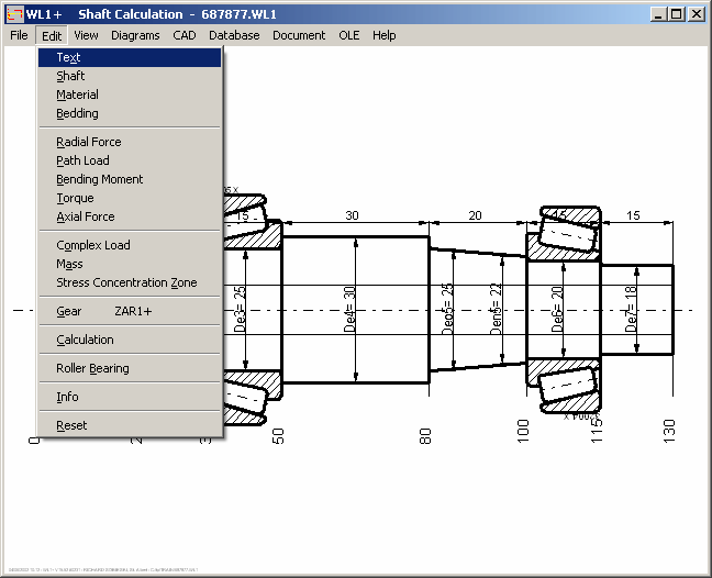 After WL1+ has calculated the shaft, you can export the DXF or IGES generated files with the scale drawing of the shaft complete with rolling bearings directly to your CAD system.