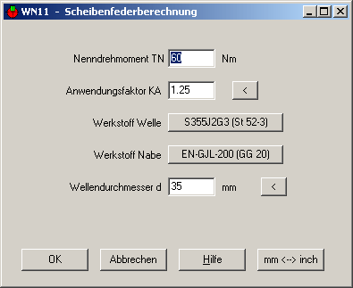Die WN11-Software berechnet die Tragfähigkeit einer Scheibenfederverbindung nach DIN 6892. Diese Norm für Paßfedern ist auch für Scheibenfedern verwendbar, wenn statt tragender Länge und tragender Höhe mit den tragenden Flächen von Wellennut, Nabennut und Scheibenfeder gerechnet wird.