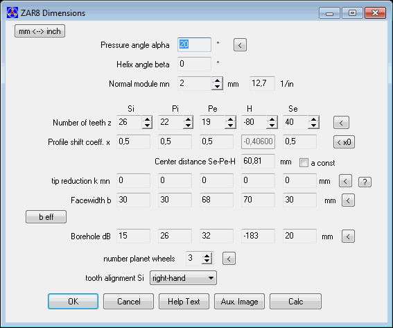 In Pre-Dimension, ZAR8 suggests dimensions of a Ravigneaux gear set after input of desired transmission of forward gears 1 and 4, input speed, power and number of teeth of the ring gear.